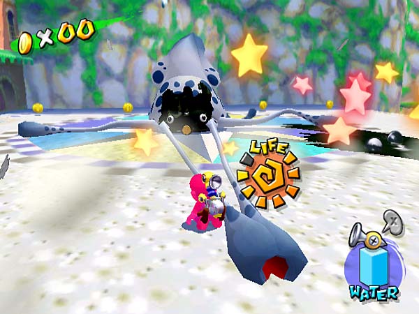 スーパーマリオサンシャインとは2002年7月19日に任天堂より発売されたニンテンドーゲームキューブ専用ソフトである。南国のリゾート地である「ドルピック島」を舞台に落書き事件の濡れ衣を着せられたマリオが落書きを掃除し、島中に散らばったシャインを集めつつ、濡れ衣を着せた真犯人を探していく。新システム「ポンプ」を使い水を使ったアクションが使用できるなど自由度が大幅に上がった作品である。