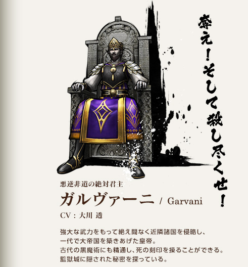 悪逆非道の絶対君主。近隣諸国を侵略し、一代で帝国を築き上げた。
