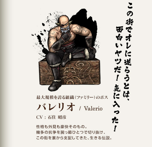 最大規模を誇るファミリーのボス。正確も外見も豪快そのもので、幾多の抗争を腕っぷし一つで切り抜けてきた。
