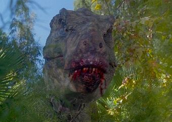 『ジュラッシク・パーク』シリーズを象徴とする大型肉食恐竜。過去作よりも今作は出番が少なく、スピノサウルスとの戦いで首をへし折られ、殺されてしまう。実在していた種としては、最大全長約13メートル、最大体重約9トンと大型である。