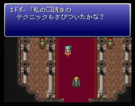 ガストラ帝国によるリターナー本部への侵攻が始まったことから、エドガーはティナと共に、リターナーの指導者であるバナンを連れてレテ川からナルシェへ逃れた。同志であるジュンの家へ向かおうとするが、ナルシェのガード達はティナを見るなり、3人が町の中に入ることを拒んだ。ガード達は帝国兵として侵攻してきたティナの顔を覚えており、エドガーは自分がフィガロの国王であることを明かして説得を試みるが、信じてもらえず力業で押し出されてしまう。話を聞こうとせず一方的にことを終わらせようとしたガード達に突き飛ばされたエドガーは「男はこれだから好きになれない。聞く耳持たないって感じだな……」とこぼす。力づくで追い出そうとするガード達を避難しながらも物言いが穏やかなのは、礼儀を重んじる一国の王ならではと言える。