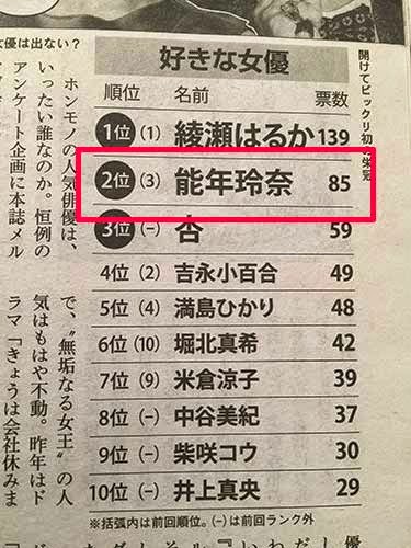 掲載しているランキングのうち、2017年度版には「好きな女優」として『あまちゃん』で主役を演じた「のん」が、「好きな男優」としては『のだめカンタービレ』の「玉木宏」がそれぞれ1位にランクインした。