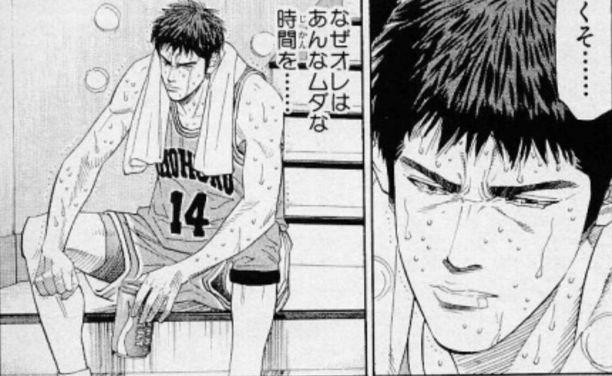 交代してベンチに下がり、脱水症状を避けるためにスポーツドリンクを飲みながら、三井は自分の荒れた2年間を悔やみ、「なぜオレはあんなムダな時間を…」と考え込む。中学時代の財産だけでバスケをやっているようなものだと自らを省みた彼は、この先技術面でも、精神的支柱としても、チームにとって欠かせない存在になっていくのである。