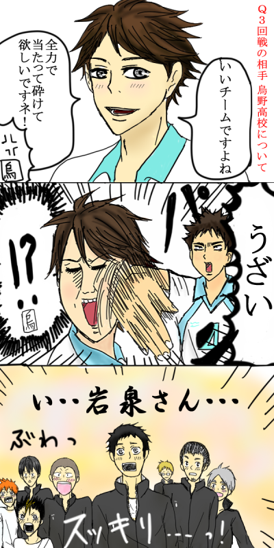 ここではバレーボールを題材にした古舘春一のスポーツ漫画『ハイキュー!!』の、ギャグ系のファンイラストをまとめた。イラストや漫画が多めだが、中にはコラ画像や動画などもある。電車の中では読めない、笑えるネタばかりを集めた。