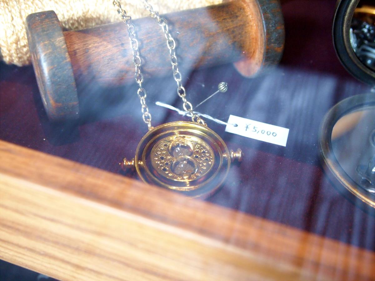 「フィルチの没収品店」で購入できるタイムターナーネックレス。ハーマイオニーが持っていた、1度ひっくり返すと1時間巻き戻せる逆時計。