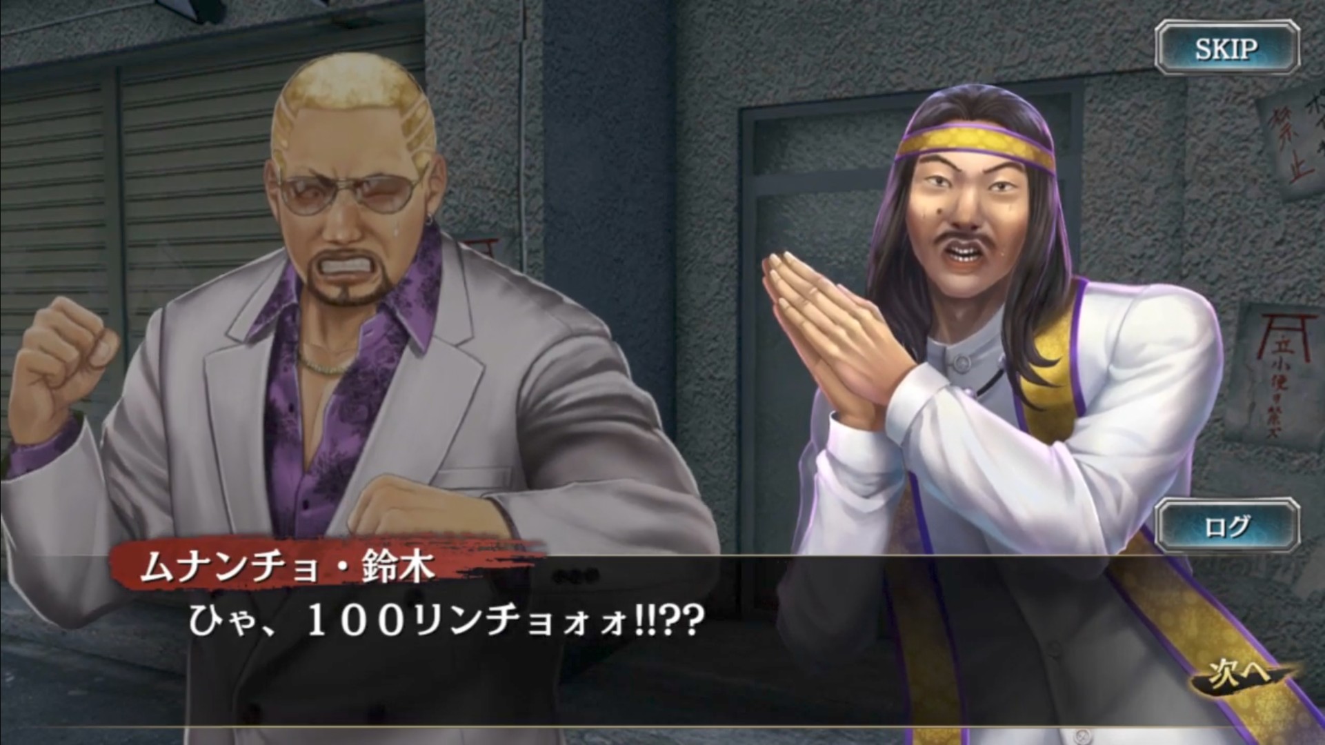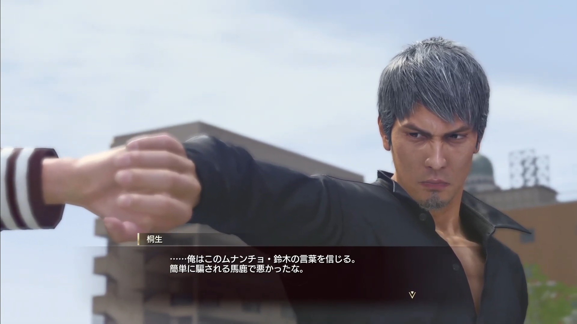 それでも納得しないチンピラから暴力を振るわれそうになったが、ムナンチョ・鈴木の先程の行動の真意とその覚悟を汲み取った桐生が「詐欺師の言う事に簡単に騙される馬鹿」を演じる形で助けに入る。