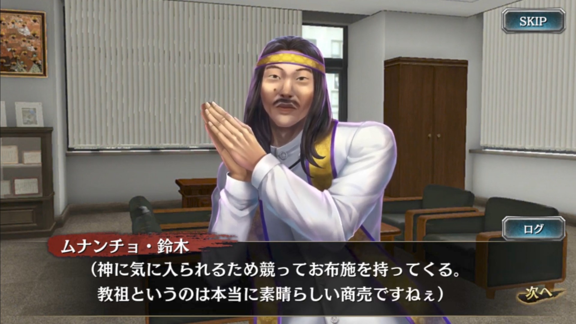 「ムナンチョヘペトナス教を蘇らせようとしているのではないのか?」と疑いを持った桐生に、見過ごす事は出来ないとして問い詰められる。そんな桐生の抱いた疑念に対しムナンチョ・鈴木は、誤解を招く行為に見えるのは致し方ない事だが、通行人達は面白半分で参加しているだけで、誰も陥れていないと弁明。
