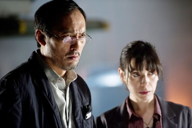 芹沢博士(左)とムートーやゴジラの動向を見守るヴィヴィアン(右)