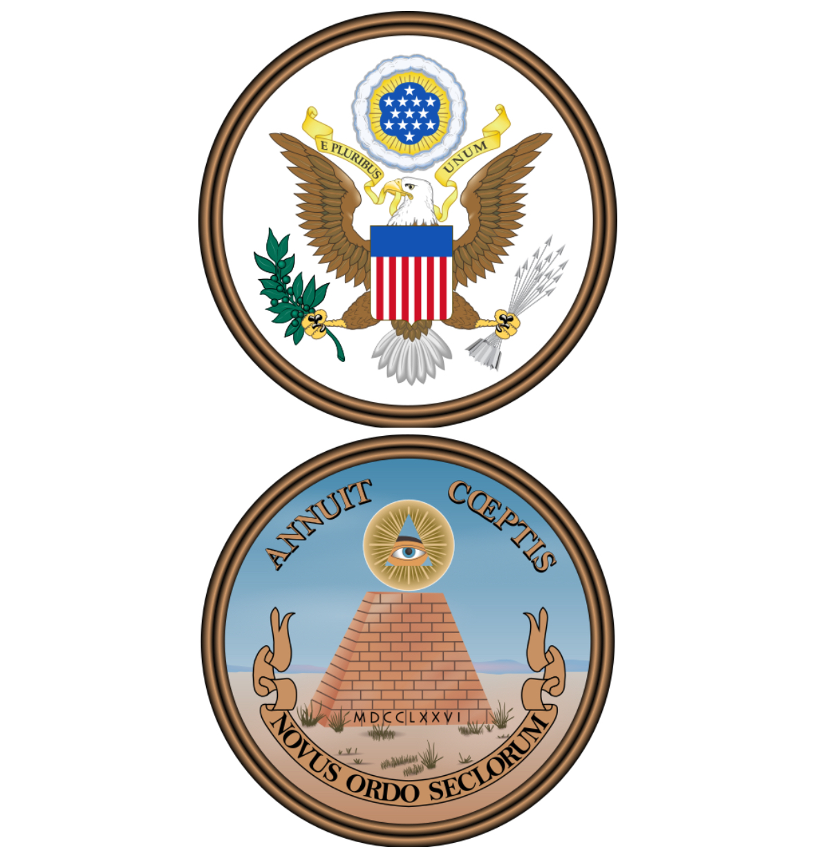 このイーグルの羽は33枚、右足に13の実を付けたオリーブ、左足に13本の矢を持ち、その頭は左のオリーブの方向を向いている。右足のオリーブは平和を表し、左足の矢は自由を守る為の戦争を意味する。そして頭がオリーブの方向を向いているのには、平和への願いが込められている。