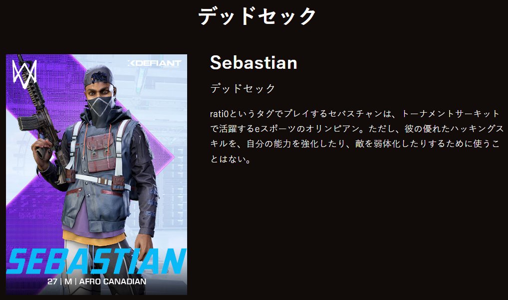 Sebatianはeスポーツで活躍している選手であるが、裏の顔はデッドセックで暗躍する凄腕ハッカーでもある。優れたハッキング能力を持っているものの、彼はeスポーツでその実力を発揮させることはなく、正々堂々選手としてプレイする信念を持っている。