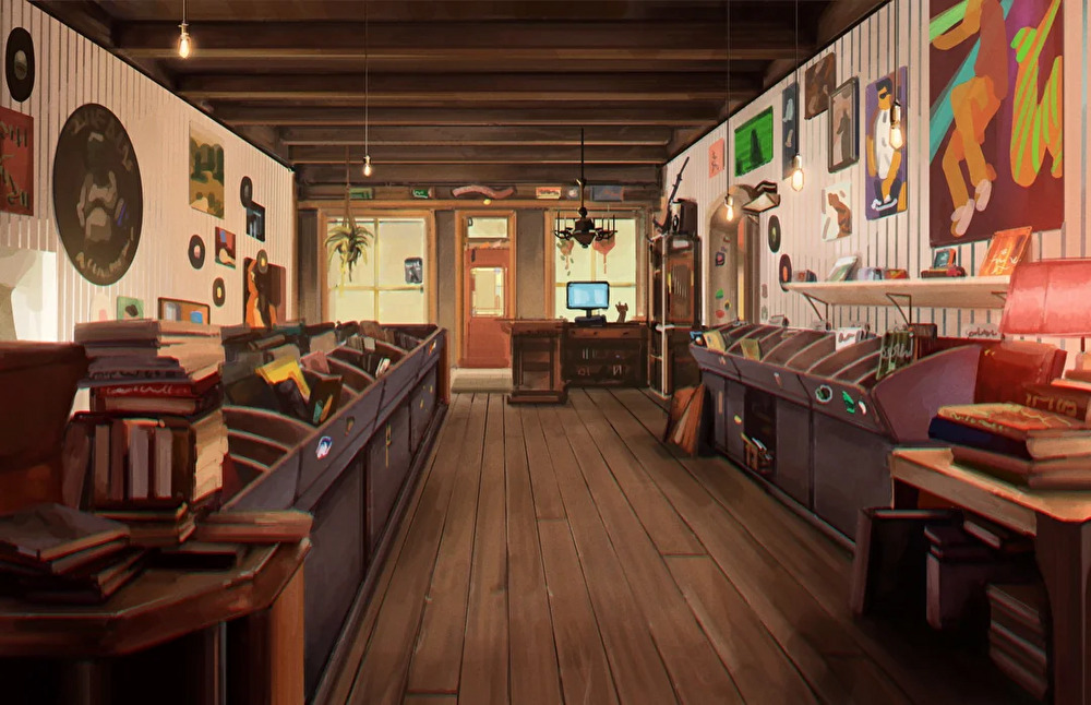 ステフが店長兼ラジオDJを務める町のレコード店。レトロなポスターや古びたスピーカーなど音楽好きが喜びそうな場所で、店の奥にはステフが使用しているラジオDJブースがある。