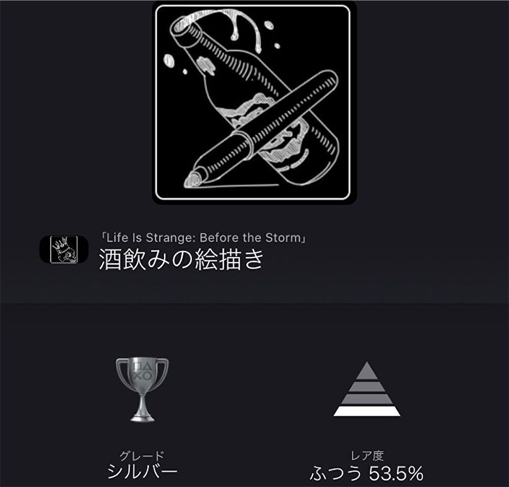 ジェームズの書斎机の上にあるシェリー酒のボトルに落書きした後、チャプターセレクト画面に表示される実績解除(トロフィー収集)画面の画像。