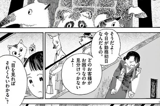 売り場に出たものの、どのお客様が何に困っているのかがさっぱりわからず右往左往する秋乃。そんな秋乃に、フロアマネージャーの東堂がお客様の目をみろとアドバイスをくれる。それでも混乱する秋乃が言った言葉が「そうだよ…今日が初出勤なんだもの。どのお客様がお困りなのか見分けつかないよ!「目を見ればそれくらいわかる」?」。そんな投げやりな言葉を吐きながらも、動物のお客様の視線の高さに腰をかがめると、何かを考えている様子のフェレットに気づく。