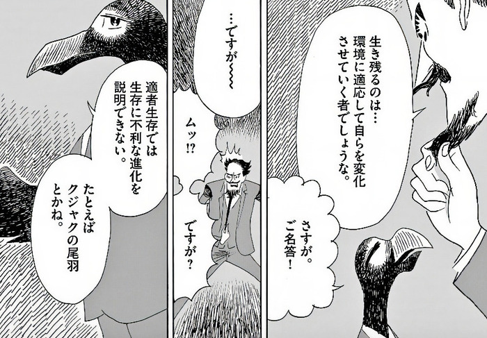 - 東堂「生き残るのは…環境に適応して自らを変化させていく者でしょうな。」/エルフ「適者生存では生存に不利な進化を説明できない。たとえばクジャクの尾羽とかね。」