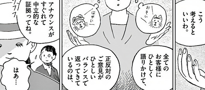 館内放送の係「全てのお客様にひとしく語りかけて、正反対のご意見が等しいバランスで返ってきているのは、アナウンスがすぐれて中立的な証拠ってね。」