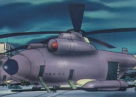 超大型輸送へリ。作中では地球連邦軍の保有する中で最大サイズを誇る。大量の兵員はもちろん、装甲車やコンバットアーマーを複数積載でき、主に基地間の物資輸送を任務とする。これほどのサイズにもかかわらずシングルローター機なのは安定性よりも積載性や燃費を優先した結果と思われる。巨体ゆえに機動性も低い。