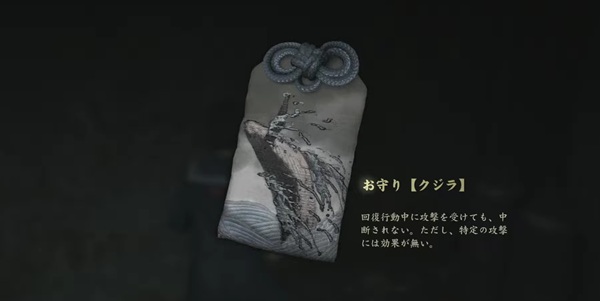 お守りを装備すると、バトル時に体力・精神力・持久力などのパラメーターを回復・強化させる効果を得られる。装備できる数は定められており、祈祷絵馬の奉納や、クリア後の周回プレイで増やすことも可能。お守りにはクジラ、ネコ、マツなど全部で40種類あり、町中で拾うか、おみくじを引いて入手する。状況に合った効果を持つお守りを装備することで、バトルを優位に進めることができる。