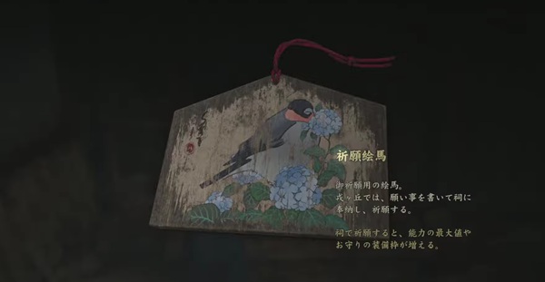 神社などで販売されている祈祷用の絵馬。願いごとを書いて祠に奉納・祈願することで、精神力・体力・持久力の最大値を上げることができる。また、お守りの装備数を増やすことも可能。