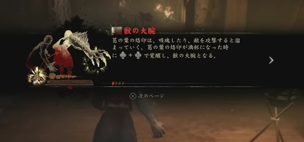 闇の神社で雛子が右腕を切り落とし、代わりに装着される狐の腕。獣のような攻撃力を持ち、武器を持たずに敵を倒すことができる。倒した敵が蘇ることを防ぐ「吸魂」や、そもそも蘇生を許さない「渾身の一撃」など、独自の技を使用可能。独自のパラメーターとして、「葛の葉の烙印」があり、吸魂や攻撃でゲージいっぱいにたまると、覚醒して「獣の大腕」に進化する。