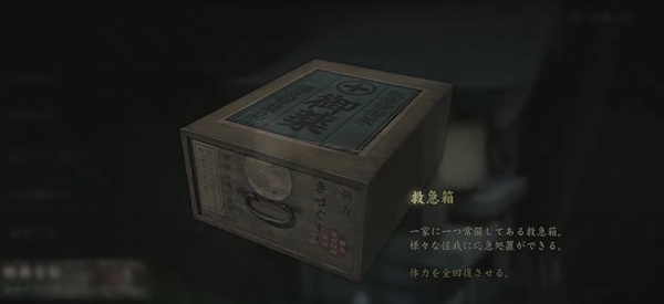 ケガの応急処置をして、体力を全回復させるアイテム。家庭に常備されている救急箱であり、さまざまな薬や包帯などが入っている。