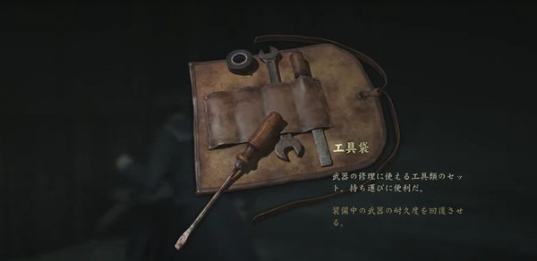装備している武器の修理をして、耐久度を回復させるアイテム。修理するための工具類が入っている。