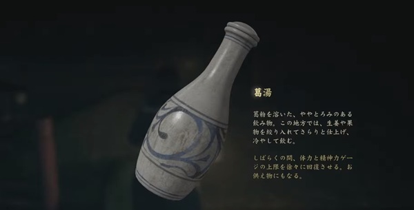 葛粉を水に溶かした飲み物で、とろみのある食感が特徴。戎ヶ丘では生姜や果物を絞って、冷やして飲む風習がある。体力と精神力のゲージ上限を回復させる効果があり、祠にお供えものとして奉納することもできる。