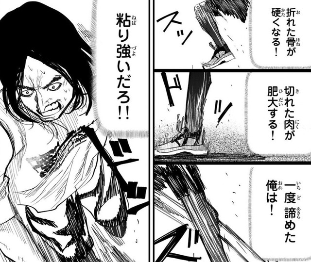 - 仁神武「折れた骨が固くなる!切れた肉が肥大する!一度諦めた俺は!粘り強いだろ!!」