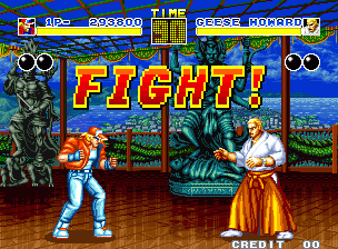 『餓狼伝説 宿命の闘い』(初代)とは、1991年にエス・エヌ・ケイ(旧社)が発売した2D対戦型格闘ゲーム。サウスタウンで暮らす格闘家のテリー・ボガード、アンディ・ボガード兄弟は義父を殺害したギース・ハワードへの復讐を誓い、彼が主催する格闘技大会へ参戦し刺客達を次々と打ち倒していく。そしてついにギースとの対決の時が来た。1991年12月からアーケード版として登場した後に、家庭用ゲーム化された。2025年の『餓狼伝説 City of the Wolves』までシリーズゲーム化し人気を集める。