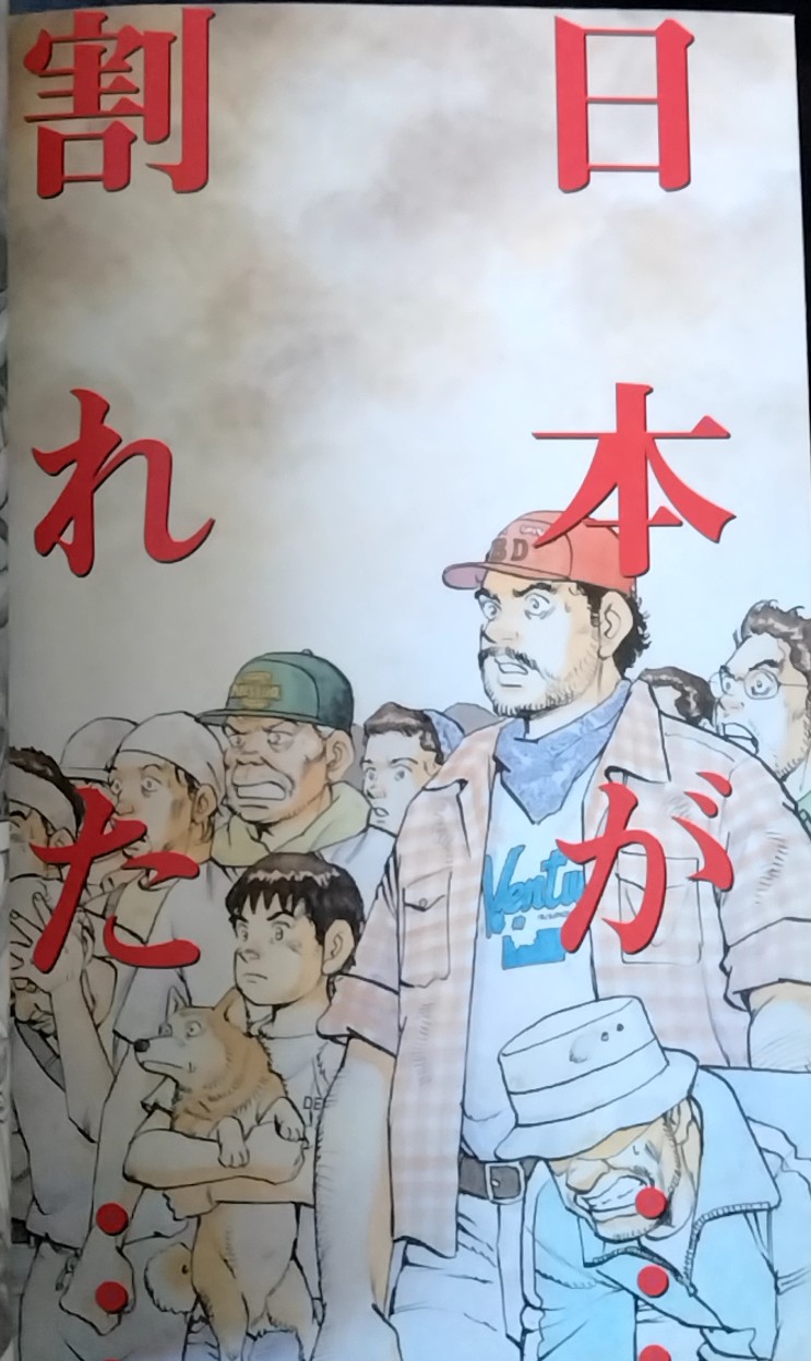 「日本が…割れた」というナレーションと共に、カラーページで人々の絶望と唖然とした表情が描かれている。日本国土分断という物語の基本背景を鮮烈に描いた名シーンである。