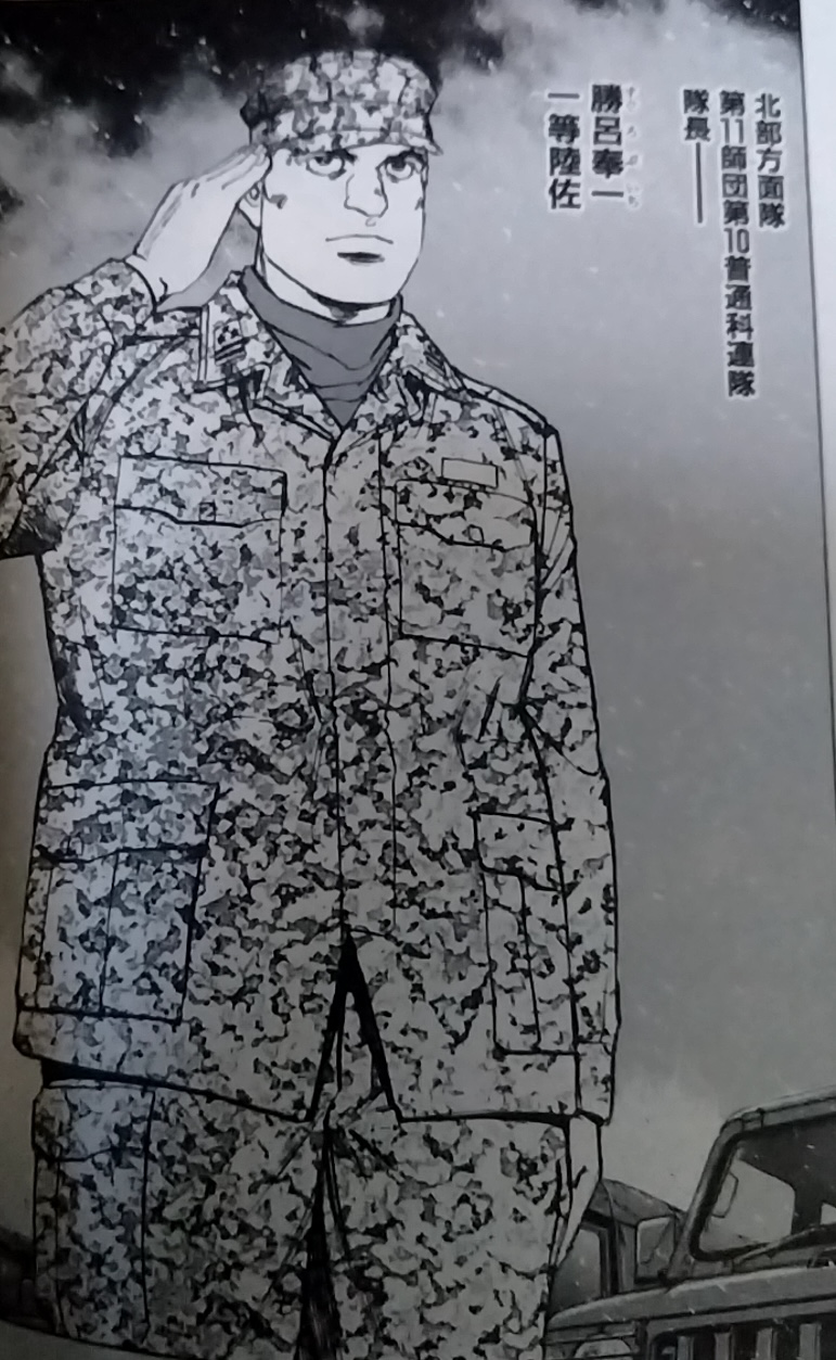 北日本陸上自衛隊自衛官の男性であり、勝呂の部下の1人である。