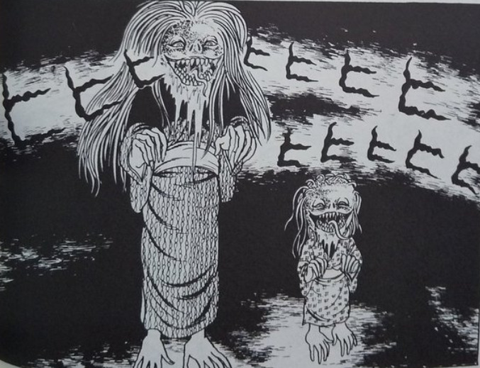 楳図かずお原作のホラー漫画『猫目小僧』は、『赤んぼ少女』や『高校生記者シリーズ』などと同時期に連載された。この時期の楳図は、視覚的な恐怖描写で読者を怖がらせる作風を確立させていて、陰影のある不気味な絵柄が際立っていた。『猫目小僧』の中で、最も視覚的な怖さを感じさせると言われているのが、『妖怪水まねき』の序盤で展開された猫目小僧の誕生シーンである。300年に1度しか生まれないとされる猫又の子供を一目見ようと、無数の妖怪が猫又のもとへと駆け付ける。その妖怪たちが圧倒的に恐ろしく描かれているのだ。妖怪を描く漫画家といえば、水木しげるが代表格であるが、水木の描く妖怪にはどことなく愛嬌やユーモアがあるのに対して、楳図作画の妖怪はひたすら不気味である。多くのファンを恐怖のどん底へと突き落とした名場面だと高く評価されている。ちなみに、このシーンの中央下の方に『赤んぼ少女』のタマミと思しきキャラクターが描かれている。