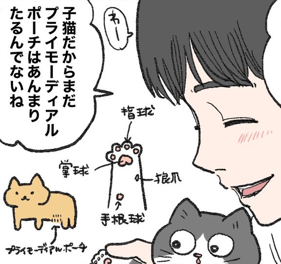 社長の甥(左)に体を観察されてやや戸惑うプンちゃん(中央下)左下の絵の通り、猫のお腹にあるたるんだ部分のことを指す。