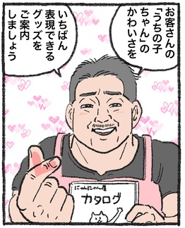 強面だが笑顔が優しい店長がオーダーメイドのグッズを作ってくれる、猫好きに大人気の猫用グッズ専門店。客が飼っている「うちの子」達の可愛さを引き出す最高のグッズを打ち合わせをしながら提案してくれ、そのクオリティの高さには定評がある。社長たちも御用達。猫の前足に通してリュックのように背負えるアヒルなど、他の店にはない個性的なグッズも販売している。