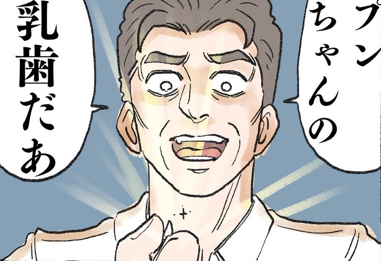 プンちゃんの乳歯を見つけて喜ぶ社長。