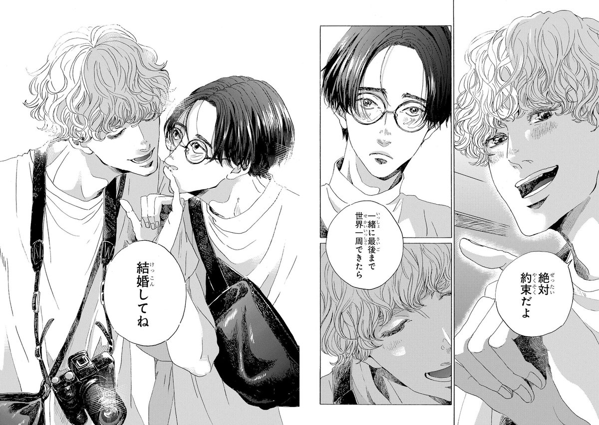 タイに着いて旅が始まったと実感する朝日に深月は「絶対約束だよ。一緒に最後まで世界一周できたら結婚してね」と笑顔で言う。すると朝日は照れ隠しで深月の指を噛んでしまうのだった。