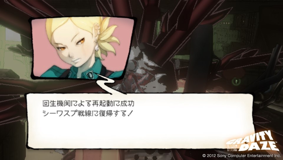 『GRAVITY DAZE』とは、ソニー・コンピュータエンタテインメントより2012年に発売されたPlayStation Vita用ゲームソフト。オープンスペースの箱庭系ゲームであり、見える範囲には全てシームレスに移動できる。フレンチコミックのエッセンスと、重力方向を自由に定義できるデザインの2つをコンセプトとして制作された。「重力嵐」の脅威にさらされ、壊滅の危機に瀕している空中都市ヘキサヴィルで、一人の少女が目を覚ます。少女は、嵐に奪われた街を取り戻すために奔走する。