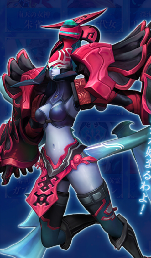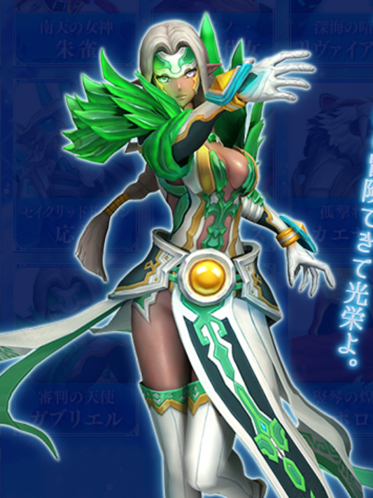戦場を司る女神。その手に携える【英霊の聖剣】と【英霊の神盾】は、揺るぎない英雄の魂を象徴している。成長を怠る者を何よりも軽蔑する一方、夢を抱き努力を続ける戦士には、称賛として心からの口づけを贈る。強敵との戦いでは古の英霊を召喚して仲間の命を護り、受けたダメージを敵にはね返すその姿は、まさに戦いの女神の名に相応しい。