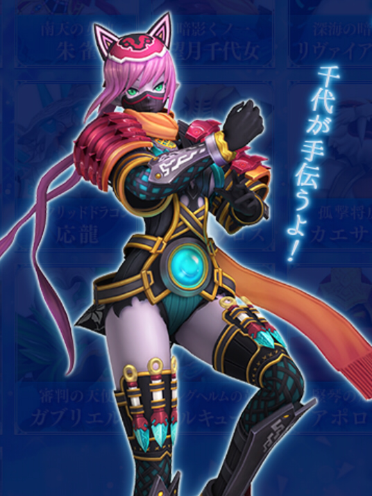 甲賀流の奥義を掌中に収めた一流のくノ一。彼女が振るう武器は、自らの手で作り上げた特殊な忍具の数々。敵に対しては一撃で命を刈り取る致命的な暗殺者として立ちふさがる一方、味方に対しては非常に優れたサポーターとして機能する。彼女が繰り出す変幻自在の忍法があれば、いかなる困難な状況も乗り越えることができるだろう。