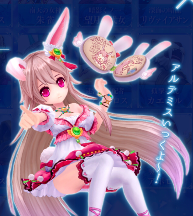 月に乗って旅を続け、見聞した出来事を愛用の「兎の絵本」に描き留めることが大好きな無邪気な少女。実は、あのアポロンを弟に持つ姉という一面も持っている。彼女が授ける聖なる祝福は、仲間の生命力を回復させるだけでなく、防御力を劇的に向上させる。月の女神による加護があれば、いかなる強敵を相手にしても決して屈することなく、打ち倒すことができるだろう。