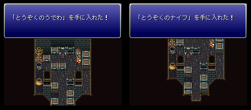 ゾゾ街の宝箱で入手できる他、世界崩壊後にゾゾ山に出現する「オリエントデビル」からレア枠で盗むこともできる。コロシアムで「盗賊のナイフ」を賭けて、バルーンビストとの戦いに勝利すれば景品として入手することもできるが、装備できるのはロックとゴゴのみなので、2個手に入れば充分である。