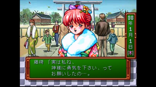 日頃の行いのためか、初詣デートに誘うと毎年おみくじで大吉を引いている詩織。彼女のときめき度が告白条件を満たしている際に初詣に行くと、その年のお願いごとが「実は私ね、神様に勇気を下さい、ってお願いしたの…。」であることを教えてくれる。主人公に理由を聞かれて慌ててはぐらかすものの、順調にステータスを上げ、卒業式を間近に控えたプレイヤーとしては、理由は言わずもがなといったところだ。