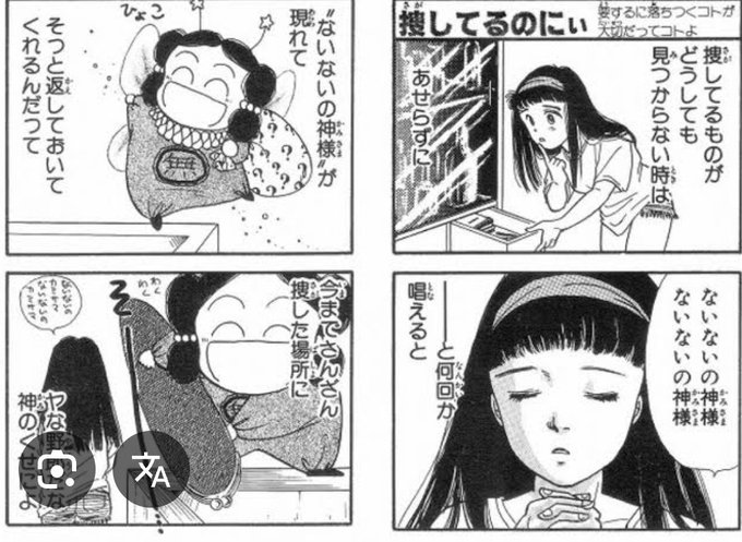 無くしものを見つけてくれるという神様。手を合わせて「ないないの神様」と3回唱えるだけで無くしものを見つけてきてくれるが、目の前に持ってきてくれるわけではなく、これまで散々探した場所に物だけ置いて去っていってしまう。作者の別作品である『ご笑覧ください』の登場人物。