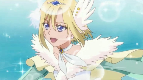 はながデザインしたスケート衣装を模した服を着用しており、肩部分や髪飾りに翼のような飾りがある。袖や腰部分の布の裏地、変身時の背景からして緑キュア扱いである様子。