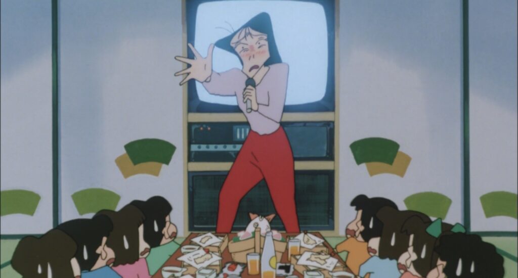 劇場版作品『クレヨンしんちゃん ブタのヒヅメ大作戦』では「ひとり上手」を情感たっぷりに披露して園児たちを恐怖に陥れたシーンでインパクトを残し、その後も「地上の星」を披露するなど、普段自身で設定しているキャラとはかけ離れた選曲で視聴者の笑いを誘った。なお、一昔前には実際に「失恋した時には中島みゆきを聴いて泣くのがいい」という俗説が流れていたこともあるため、彼女の「男運ないキャラ」を活かすものとして選ばれている可能性が高いといえる。