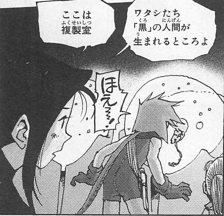 黒の市民の複製室での一コマ。培養した細胞をこの部屋の人工子宮で育て、ここから黒の市民が誕生する。
