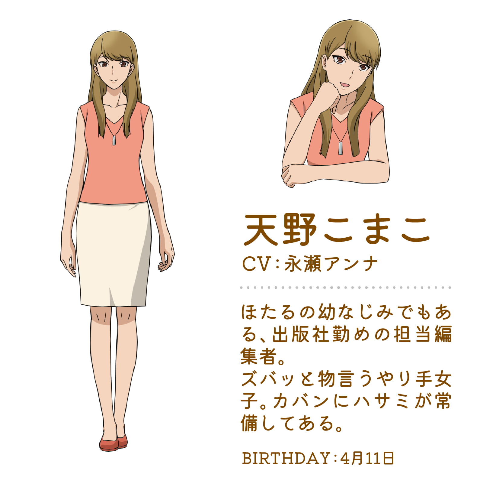 ほたるの幼なじみで、彼の担当編集者を務める。何かとほたるの世話を焼く性格。ずけずけと物を言うことが多いが、実際にはほたるときのこいぬの親密な仲に嫉妬するなど、表に出さない複雑な内面も抱えている。編集長の息子である矢良をほたるに紹介して以来、ほたるを巡り、矢良と互いに「ガチ」「ビッチ」と呼び合う三角関係のような奇妙な仲に発展している。