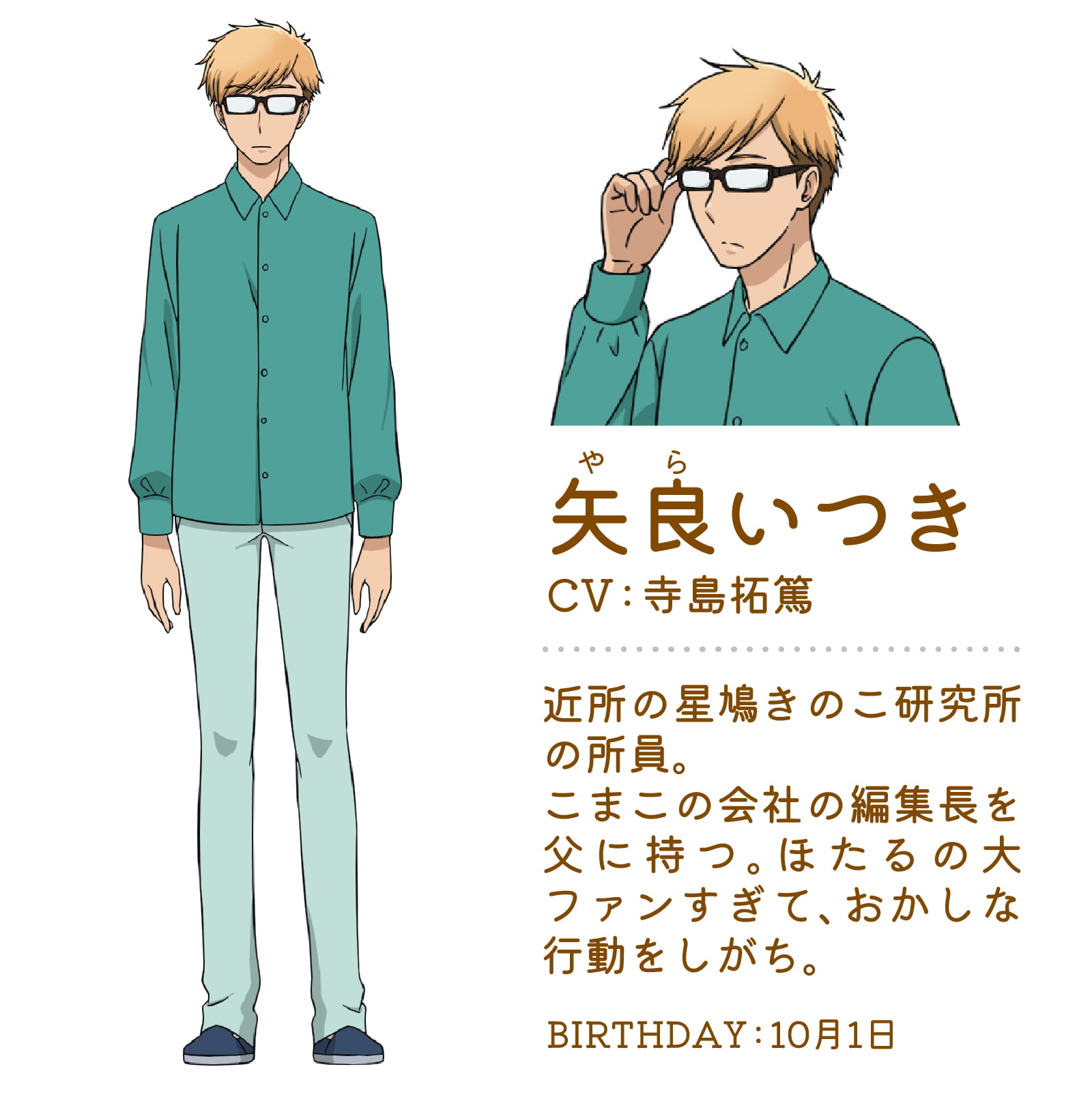 編集長の息子であり、近所のきのこ研究所に勤める職員。親のコネを利用してほたるに接触を図った。ややストーカー気質を持つ同性愛者で、元々ほたるの絵本の大ファンだったが、本人に会って一目惚れして以来、頻繁にほたるの家に出入りするようになる。こまことほたるを巡り争う一方、きのこいぬともほたるを取り合って喧嘩をすることがある。当初はモヒカンに近い奇抜な髪型をしていたが、きのこいぬとの争いの最中、こまこに髪の一部を切られたため、現在は刈り上げに近い髪型に落ち着いている。